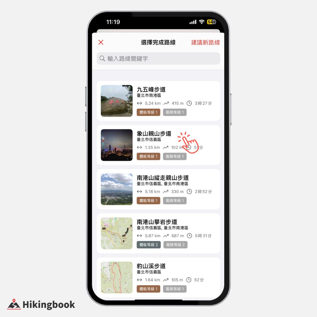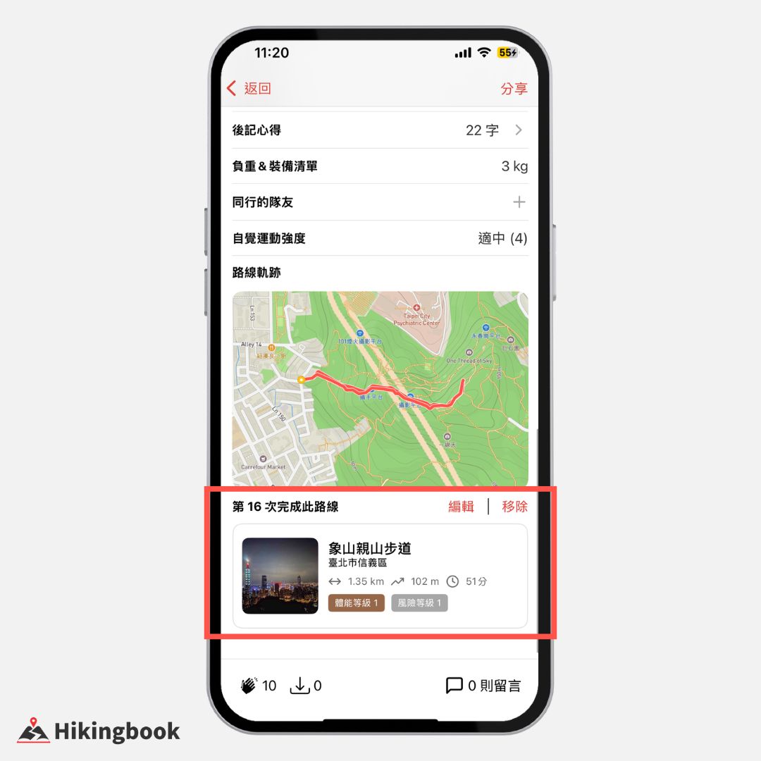 你可以將個人活動紀錄連結至 Hikingbook 站上的路線,操作步驟如下: