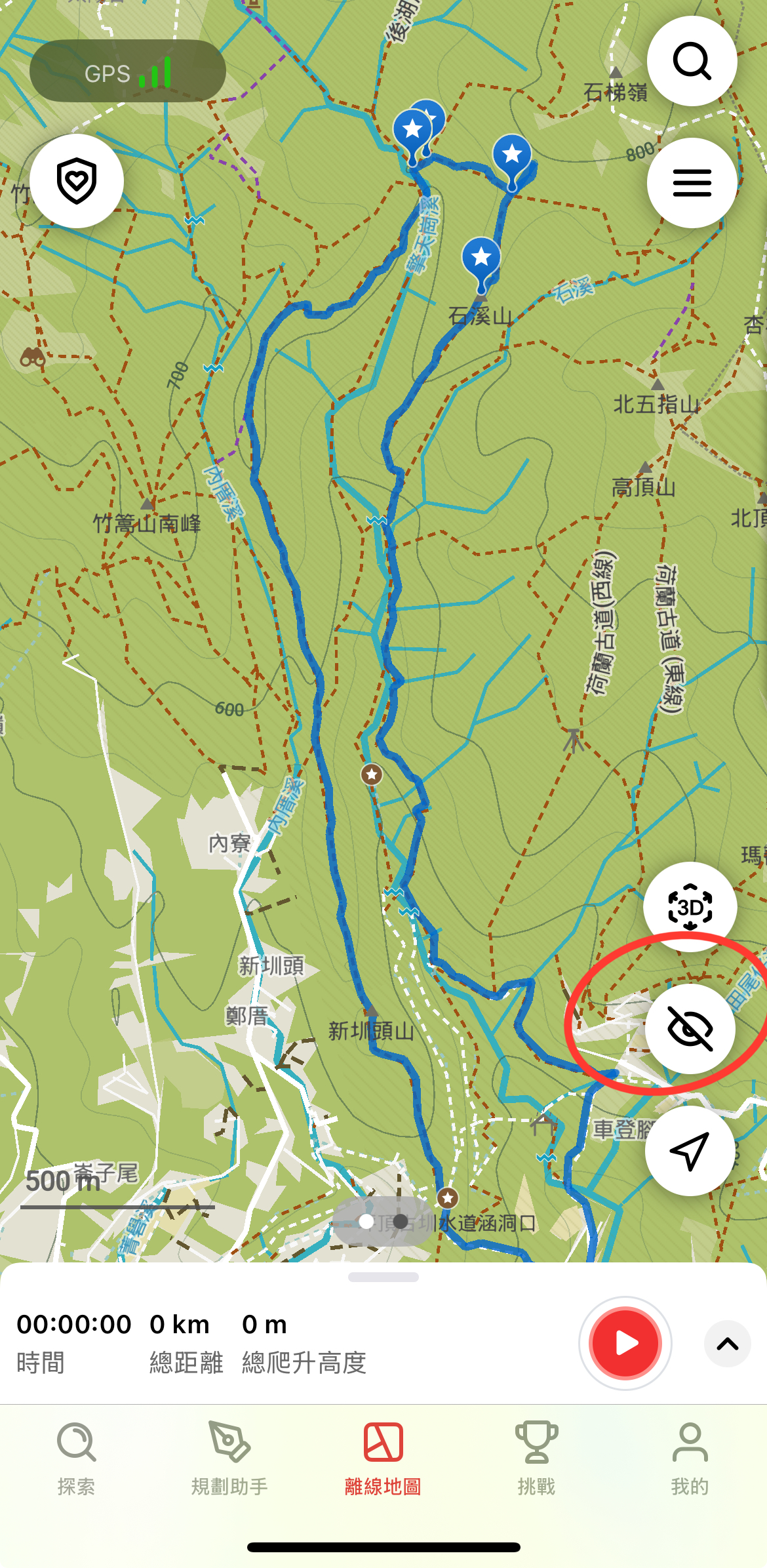 地圖右下有一顆像眼睛的按鈕,以前都不知道是做什麼用的,上禮拜出去走路不小心按到,才發現那是可以快速切換要不要顯示軌跡的功能,這樣很方便,就不用每次都從面板的選擇顯示路線那邊開關了,點一下,參考的軌跡就出現,再點一下,軌跡就消失,有時候不想看到那麼多資訊的時候可以暫時隱藏,分享給大家用用看啊!