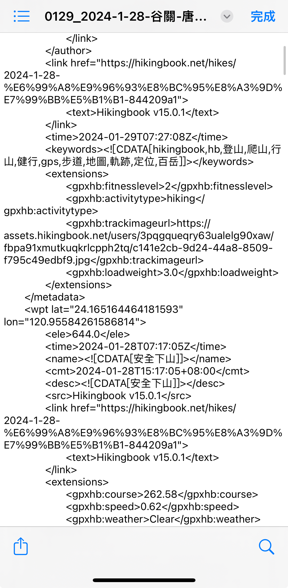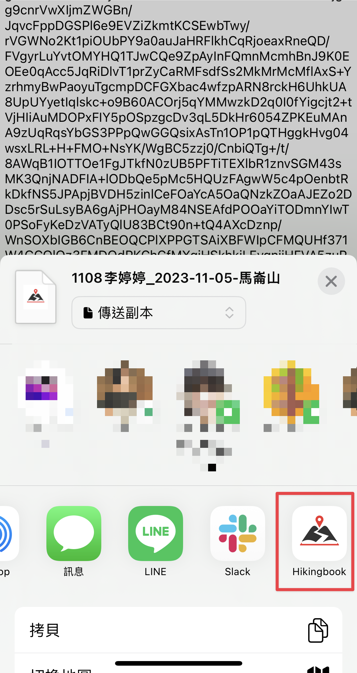 你可以點一下左下的「分享」圖示,然後選擇 Hikingbook,就可以將 GPX 檔案匯入到 App。