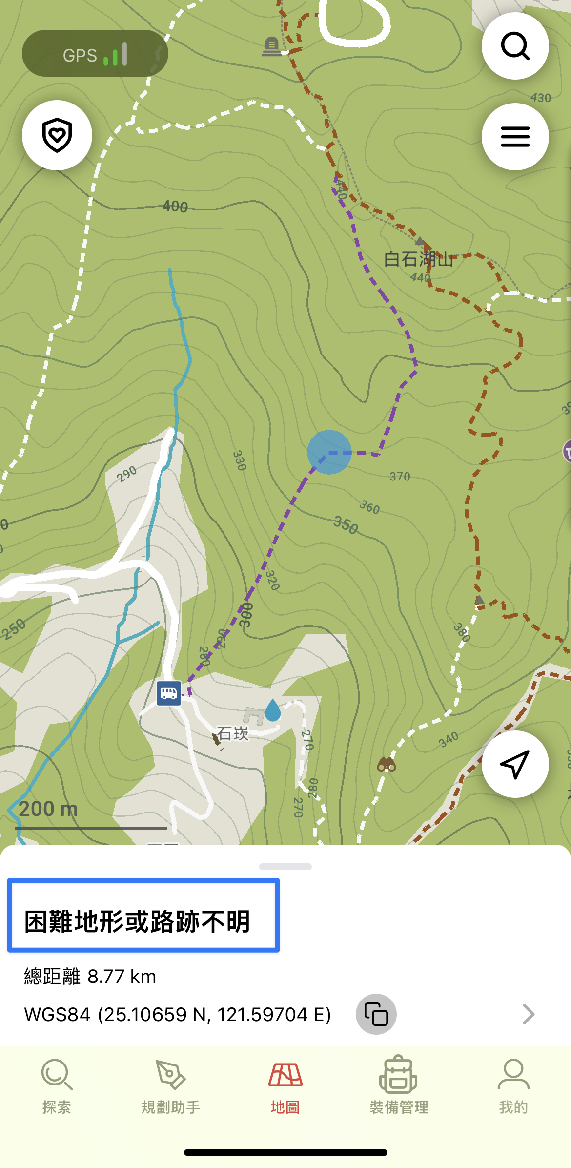 紫色線條是「困難路線」的標示,對著路徑長按,你會在下方看到路況的描述。